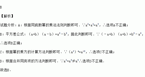 B 【解析】 试题分析:A:根据同底数幂的乘法法则判断即可.∵a2•a3=a5,∴选项A不正确; B:平方差公式:(a+b)(a﹣b)=a2﹣b2,据此判断即可.∵(﹣a+b)(a+b)=b2﹣a2, ∴选项B正确; C:根据幂的乘方的计算方法判断即可.∵(a3)4=a12,∴选项C不正确; D:根据合并同类项的方法判断即可.∵a3+a5≠a8∴选项D不正确. ...