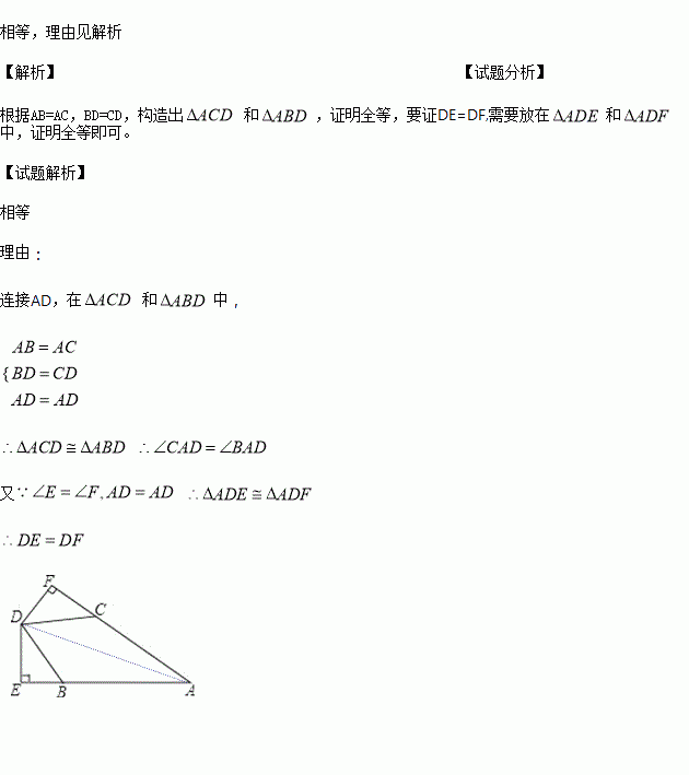 已知,如图,AB=AC,BD=CD,DE⊥AB于点E,DF⊥AC于点F,试问:DE和DF相等吗?说明理由.