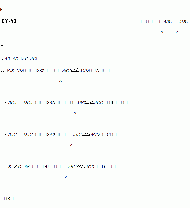 B 【解析】试题解析:在△ABC和△ADC中 ∵AB=AD,AC=AC, ∴当CB=CD时,满足SSS,可证明△ABC≌△ACD,故A可以; 当∠BCA=∠DCA时,满足SSA,不能证明△ABC≌△ACD,故B不可以; 当∠BAC=∠DAC时,满足SAS,可证明△ABC≌△ACD,故C可以; 当∠B=∠D=90°时,满足HL,可证明△ABC≌△ACD,故D可以;...