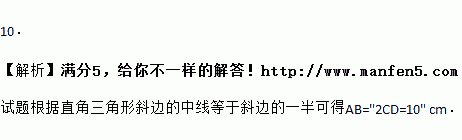 如图,已知Rt△ABC中,∠ACB=90°,D是AB的中点, CD=5cm,则AB= cm.