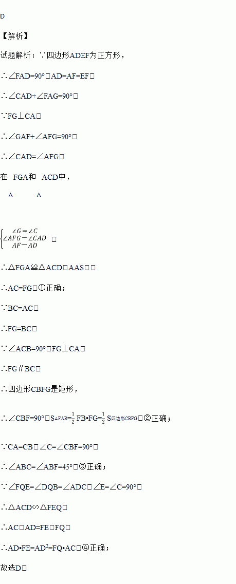 如图,CB=CA,∠ACB=90°,点D在边BC上(与B,C不重合),四边形ADEF为正方形,过点F作FG⊥CA,交CA的延长线于点G,连接FB,交DE于点Q,给出以下结论:①AC=FG;②S△FAB∶S四边形CBFG=1∶2;③∠ABC=∠ABF;④AD2=FQ·AC,其中正确结论的个数是( )