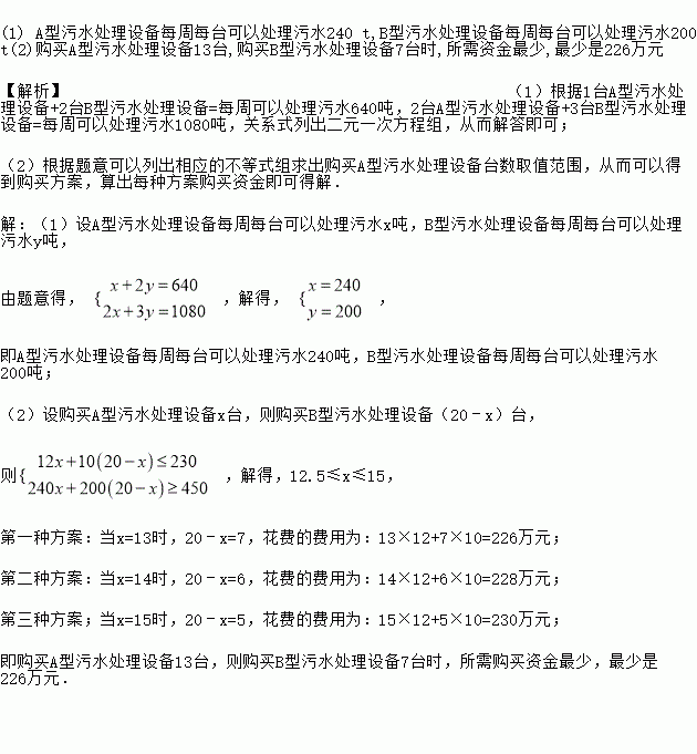 (2)经预算,市污水处理厂购买设备的资金不超过230万元,每周处理污水的量不低于4 500 t,请你列举出所有购买方案,并指出哪种方案所需资金最少,最少是多少.