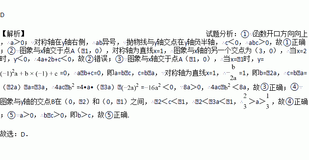 如图,已知二次函数y=ax2+bx+c(a≠0)的图象与x轴交于点A(﹣1,0),与y轴的交点B在(0,﹣2)和(0,﹣1)之间(不包括这两点),对称轴为直线x=1.下列结论:①abc>0 ②4a+2b+c>0 ③4ac﹣b2<8a ④<a<⑤b>c.其中含所有正确结论的选项是(  )