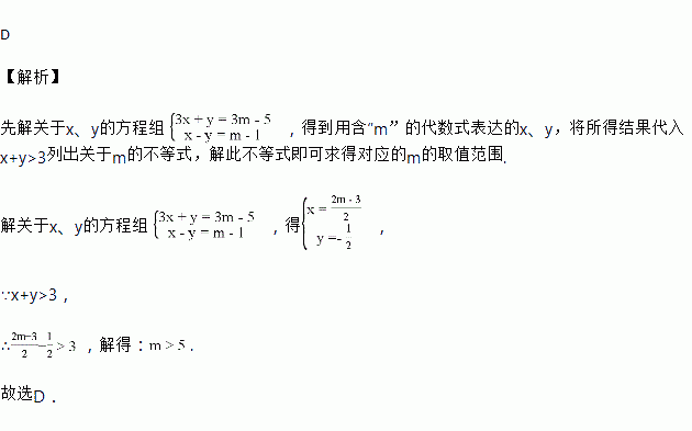 已知关于x,y的二元一次方程组,若x+y>3,则m的取值范围是( )