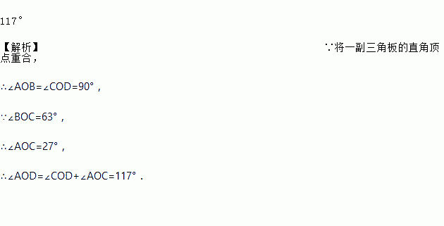 如图,将一副三角板的直角顶点重合,摆放在桌面上,若∠BOC=63°,则∠AOD= __.