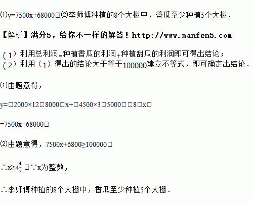 (2)求出李师傅种植的8个大棚中,香瓜至少种植几个大棚? 才能使获得的利润不低于10万元.