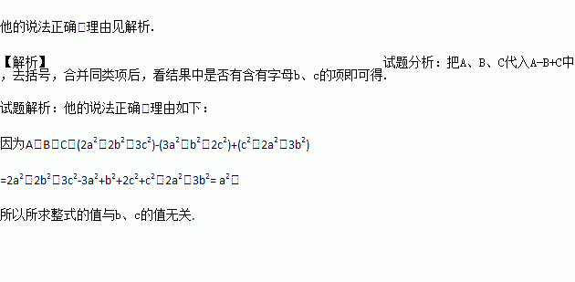 有这样一道题:已知A=2a2+2b2-3c2,B=3a2-b2-2c2,C=c2+2a2-3b2,当a=1,b=2,c=3时,求A-B+C的值.小刚说:“题目中给出的b=2,c=3是多余的.”他的说法正确吗?为什么?