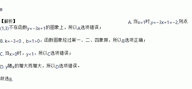 B 【解析】A. 当x=1时,y=?3x+1=?2,则点(1,3)不在函数y=?3x+1的图象上,所以A选项错误; B. k=?3<0,b=1>0,函数图象经过第一、二、四象限,所以B选项正确; C. 当x>0时,y<1,所以C选项错误; D. y随x的增大而增大,所以D选项错误。 故选B.