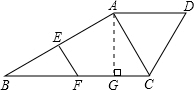 分析:过点A作AG⊥BC于点G.根据平行线等分线段定理发现三角形ABC的中位线EF,从而求得AC的长,再根据30°的直角三角形的性质求得BG、AB的长,再根据直角三角形的面积公式即可求得其斜边上的高AG;根据等边三角形的判定,发现等边三角形ACD,进一步求得AD的长,从而求得梯形的面积.
