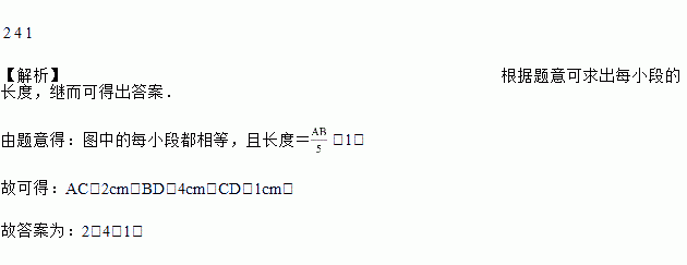 如图,点C分AB为2∶3,点D分AB为1∶4,若AB为5cm,则AC=_______cm,BD=_______cm,CD=_______cm.