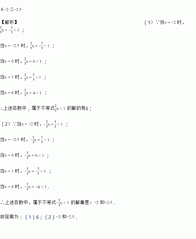 在下列各数:-2,-2.5,0,1,6中,不等式x>1的解有__________;不等式-x>1的解有__________.