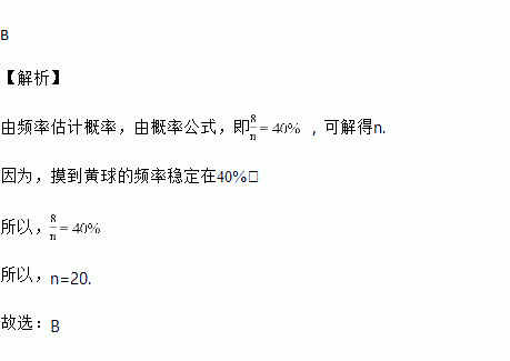 在一个不透明的盒子里有n个除颜色外其他均相同的小球,其中有8个黄球,采用有放回的方式摸球,结果发现摸到黄球的频率稳定在40%,那么可以推算出n大约是( )