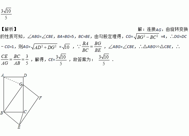 如图,在矩形ABCD中,AB=5,BC=3,将矩形ABCD绕点B按顺时针方向旋转得到矩形GBEF,点A落在矩形ABCD的边CD上,连接CE,则CE的长是__________.