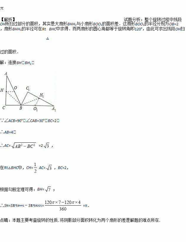 如图,Rt△ABC中,∠ACB=90°,∠CAB=30°,BC=2,O、H分别为边AB、AC的中点,将△ABC绕点B顺时针旋转120°到△A1BC1的位置,则整个旋转过程中线段OH所扫过部分的面积(即阴影部分面积)为_____.