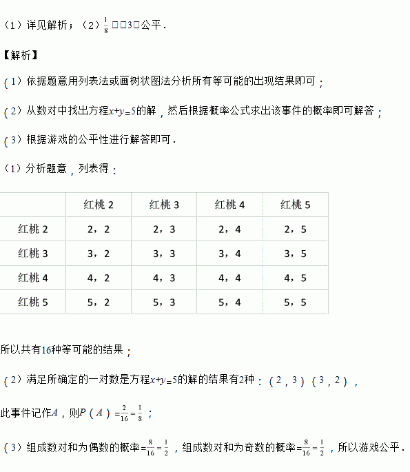 (2)求小明、小华各摸一次扑克牌所确定的一对数是方程x+y=5的解的概率;