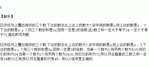 在日历纵列上圈出了三个数,算出它们的和,其中正确的一个是( )