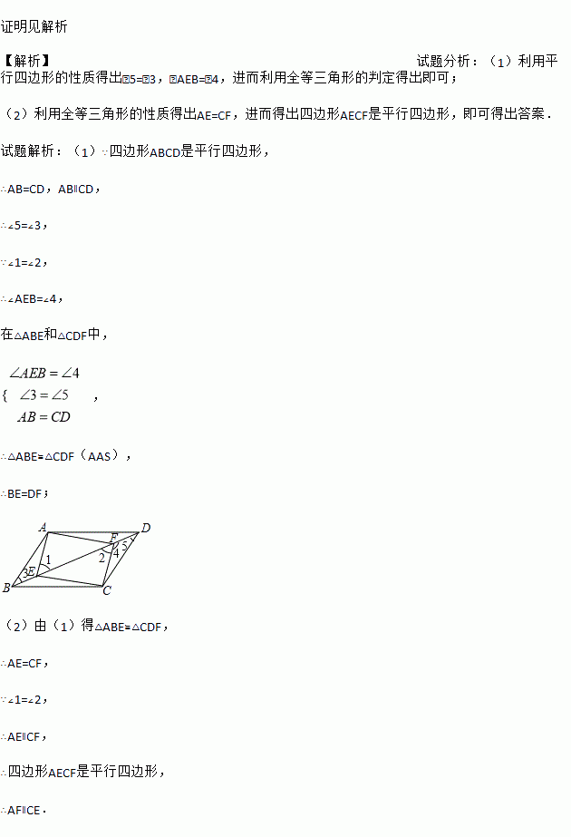 如图,四边形ABCD是平行四边形,E,F是对角线BD上的点,∠1=∠2.