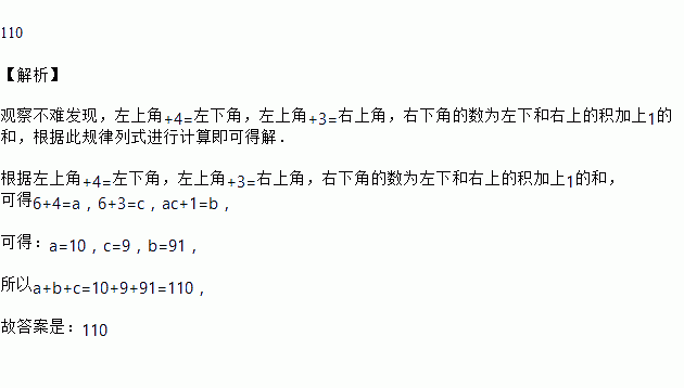 琪琪同学在如图所示的各大正方形中的四个小正方形中填入一些数字,且数字之间都有一定的规律,按此规律可得出a+b+c=________.