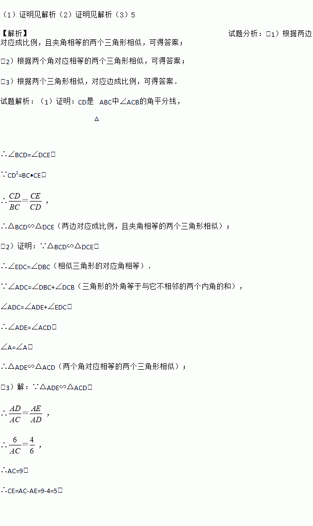 (1)证明见解析(2)证明见解析(3)5 【解析】试题分析:(1)根据两边对应成比例,且夹角相等的两个三角形相似,可得答案; (2)根据两个角对应相等的两个三角形相似,可得答案; (3)根据两个三角形相似,对应边成比例,可得答案. 试题解析:(1)证明:CD是△ABC中∠ACB的角平分线, ∴∠BCD=∠DCE. ∵CD2=BC•CE, ∴, ∴△B...