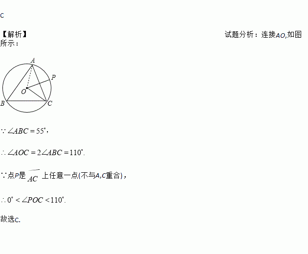 上任意一点(不与A,C重合),∠ABC=55°,则∠POC的取值范围x是( )