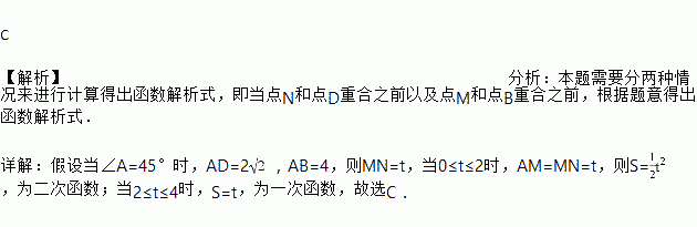 如图,点M为?ABCD的边AB上一动点,过点M作直线l垂直于AB,且直线l与?ABCD的另一边交于点N.当点M从A→B匀速运动时,设点M的运动时间为t,△AMN的面积为S,能大致反映S与t函数关系的图象是( )