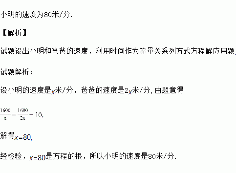 小明的家离学校1600米,一天小明从家出发去上学,出发10分钟后,爸爸发现他的数学课本忘记拿了,立即带上课本去追他,正好在校门口追上他,已知爸爸的速度是小明速度的2倍,求小明的速度.