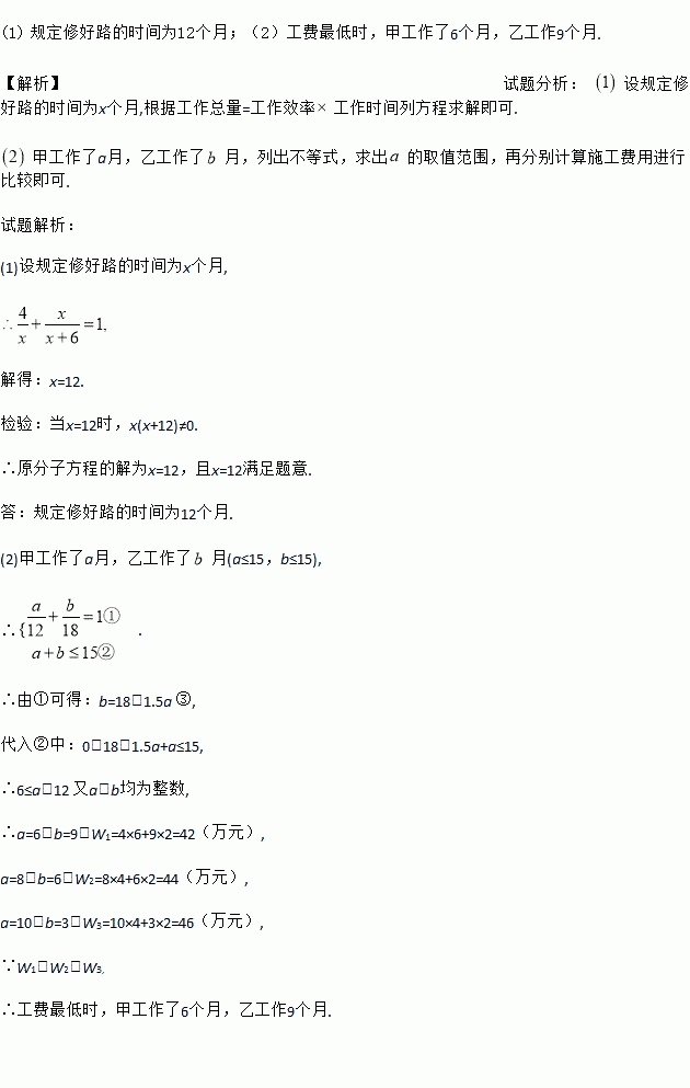 (2)ÏÖÒªÇó¼×¡¢ÒÒÁ½¸ö¹¤³Ì¶Ó¶¼²Î¼ÓÕâÏ³Ì£¬µ«ÓÉÓÚÊܵ½Ê©¹¤³¡µØÌõ¼þÏÞÖÆ,¼×¡¢ÒÒÁ½¹¤³Ì¶Ó²»ÄÜͬʱʩ¹¤.ÒÑÖª¼×¹¤³Ì¶ÓÿÔµÄÊ©¹¤·ÑÓÃΪ4ÍòÔª£¬ÒÒ¹¤³Ì¶ÓÿÔµÄÊ©¹¤·ÑÓÃΪ2ÍòÔª.ΪÁ˽áËã·½±ã£¬ÒªÇ󣺼ס¢ÒÒµÄÊ©¹¤Ê±¼äΪÕûÊý¸öÔ£¬²»³¬¹ý15¸öÔÂÍê³É.µ±Ê©¹¤·ÑÓÃ×îµÍʱ£¬¼×¡¢ÒÒ¸÷Ê©¹¤Á˶àÉÙ¸öÔ£¿