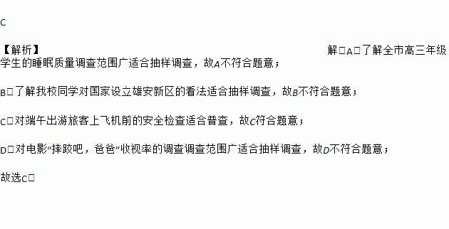C ¡¾½âÎö¡¿½â£ºA¡¢Á˽âÈ«ÊиßÈýÄ꼶ѧÉúµÄ˯ÃßÖÊÁ¿µ÷²é·¶Î§¹ãÊʺϳéÑùµ÷²é£¬¹ÊA²»·ûºÏÌâÒ⣻ B¡¢Á˽âÎÒУͬѧ¶Ô¹ú¼ÒÉèÁ¢ÐÛ°²ÐÂÇøµÄ¿´·¨ÊʺϳéÑùµ÷²é£¬¹ÊB²»·ûºÏÌâÒ⣻ C¡¢¶Ô¶ËÎç³öÓÎÂÿÍÉÏ·É»úǰµÄ°²È«¼ì²éÊÊºÏÆÕ²é£¬¹ÊC·ûºÏÌâÒ⣻ D¡¢¶ÔµçÓ°¡°Ë¤õÓ°É£¬°Ö°Ö¡±ÊÕÊÓÂʵĵ÷²éµ÷²é·¶Î§¹ãÊʺϳéÑùµ÷²é£¬¹ÊD²»·ûºÏÌâÒ⣻ ¹ÊÑ¡C£®
