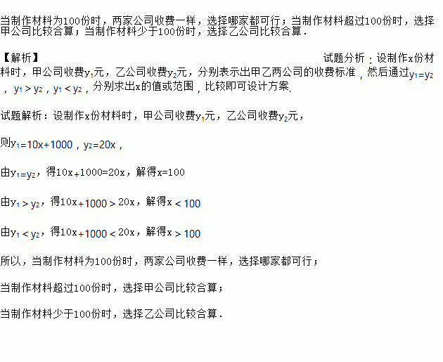 某学校要制作一批安全工作的宣传材料.甲公司提出:每份材料收费10元,另收1000元的版面设计费;乙公司提出:每份材料收费20元,不收版面设计费.请你帮助该学校选择制作方案.