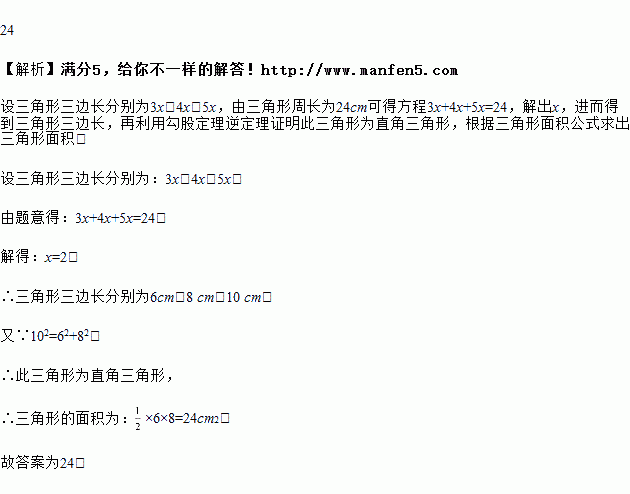 一个三角形三边长的比为3:4:5,周长是24cm,这个三角形的面积为_______cm2.