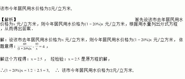 某市从今年1月起调整居民用水价格,每立方米消费上涨20%,小明家去年12月的水费是40元,而今年4月的水费是60元,已知小明家今年4月的用水量比去年12月用水量多4立方米,求该市今年居民用水的价格.