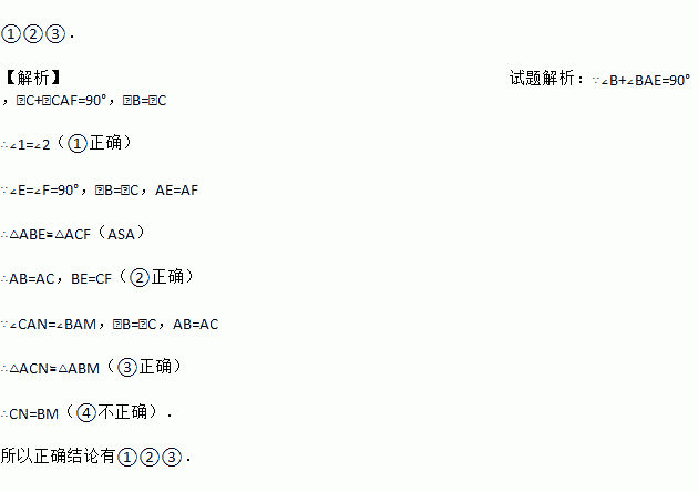如图EB交AC于M,交FC于D,AB交FC于N,∠E=∠F=90°,∠B=∠C,AE=AF.给出下列结论:①∠1=∠2;②BE=CF;③△ACN≌△ABM;④CD=DN.其中正确的结论有 (填序号).