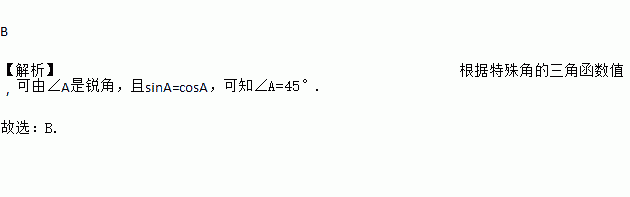 B 【解析】根据特殊角的三角函数值,可由∠A是锐角,且sinA=cosA,可知∠A=45°. 故选:B.