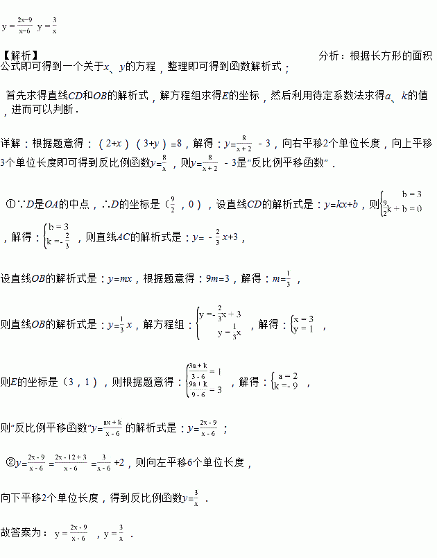 是y与x的“反比例平移函数”.如图,在平面直角坐标系中,点O为原点,矩形OABC的顶点A、C的坐标分别为(9,0)、(0,3).点D是OA的中点,连接OB、CD交于点E,“反比例平移函数