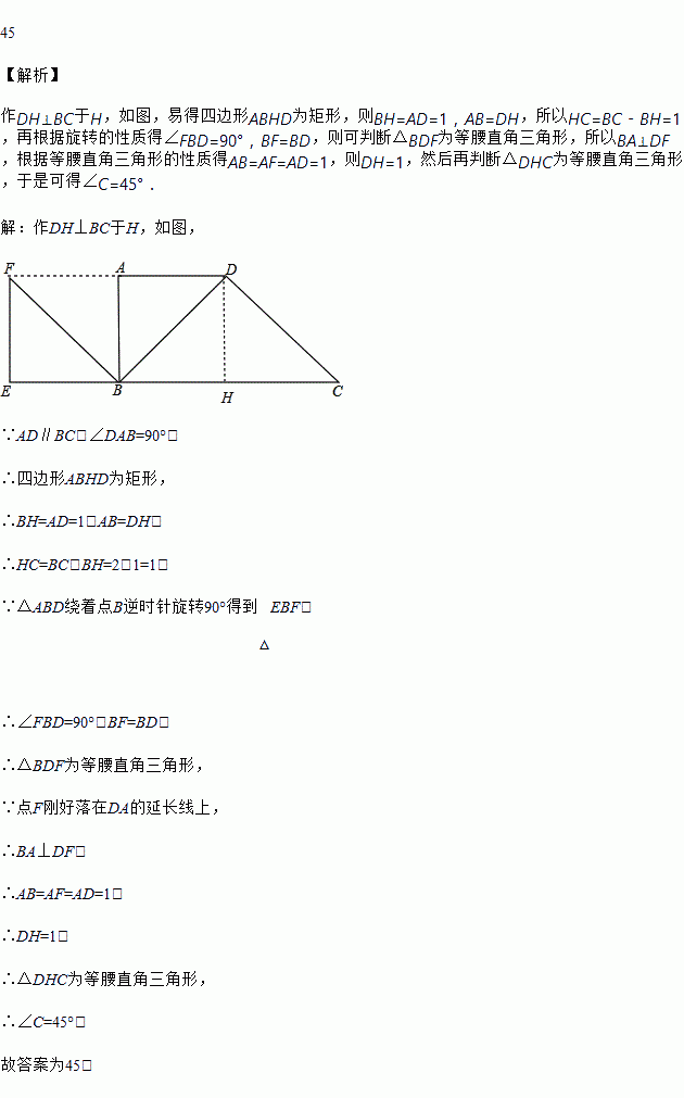 在直角梯形ABCD中,AD∥BC,∠DAB=90°,AD=1,BC=2.连接BD,把△ABD绕着点B逆时针旋转90°得到△EBF,若点F刚好落在DA的延长线上,则∠C=________°.
