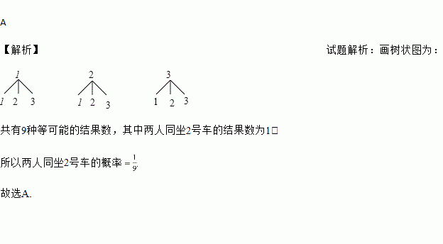 某校组织九年级学生参加中考体育测试,共租3辆客车,分别编号为1、2、3,李军和赵娟两人可任选一辆车乘坐,则两人同坐2号车的概率为( )
