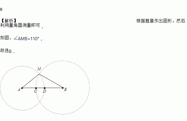 B 【解析】根据题意作出图形,然后利用量角器测量即可, 如图,∠AMB=110°, 故选B.