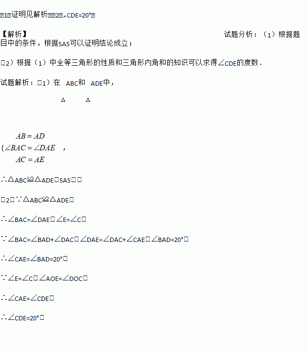 如图所示,已知△ABC中,D为BC上一点,E为△ABC外部一点,DE交AC于一点O,AC=AE,AD=AB,∠BAC=∠DAE.
