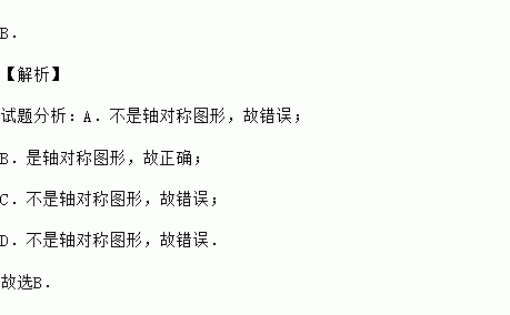 B. 【解析】 试题分析:A.不是轴对称图形,故错误; B.是轴对称图形,故正确; C.不是轴对称图形,故错误; D.不是轴对称图形,故错误. 故选B.