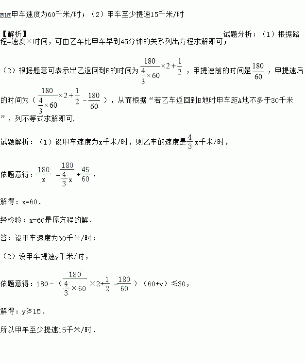 (2)乙车到达A地停留半小时后以来A地时的速度匀速返回B地,甲车到达B地后立即提速匀速返回A地,若乙车返回到B地时甲车距A地不多于30千米,求甲车至少提速多少千米/时?