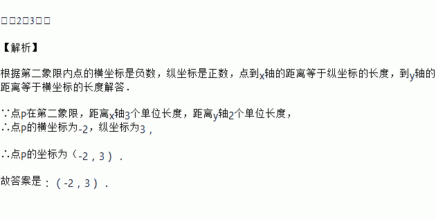 在平面直角坐标系中,已知点P在第二象限,距离x轴3个单位长度,距离y轴2个单位长度,则点P的坐标为________.