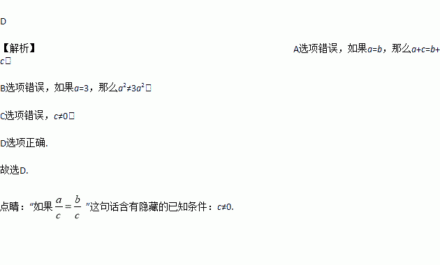 A. 如果a=b,那么a+c=b﹣c B. 如果a=3,那么a2=3a2