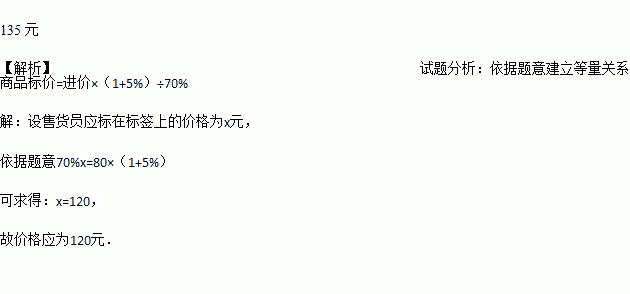 某商品的价格标签已丢失,售货员只知道“它的进价为90元,打七折出售后,仍可获利5%”,你认为售货员应标在标签上的价格为________元.