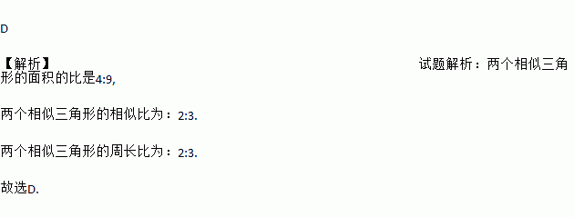 D 【解析】试题解析:两个相似三角形的面积的比是4:9, 两个相似三角形的相似比为:2:3. 两个相似三角形的周长比为:2:3. 故选D.