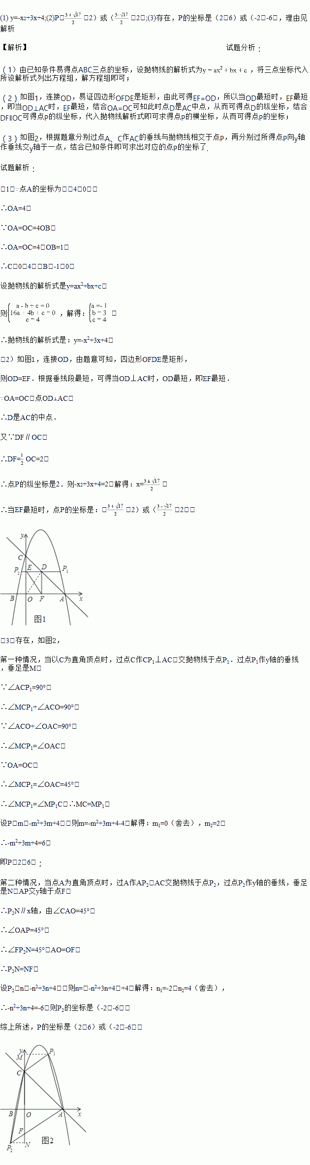 (2)过动点P作PE垂直于y轴于点E,交直线AC于点D,过点D作x轴的垂线,垂足为F,连接EF,当线段EF的长度最短时,求出点P的坐标;
