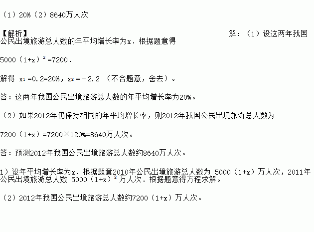 (2)如果2012年仍保持相同的年平均增长率,请你预测2012年我国公民出境旅游总人数约多少万人次?