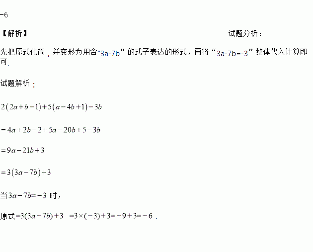 -6 【解析】试题分析: 先把原式化简,并变形为用含“3a-7b”的式子表达的形式,再将“3a-7b=-3”整体代入计算即可. 试题解析: 当时, 原式 .