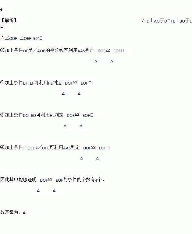 如图,FD⊥AO于D,FE⊥BO于E,下列条件:①OF是∠AOB的平分线;②DF=EF;③DO=EO;④∠OFD=∠OFE.其中能够证明△DOF≌△EOF的条件的个数有__个.