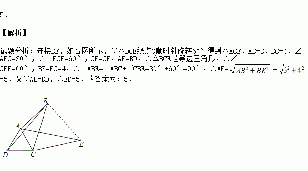 如图,在四边形ABCD中,∠ABC=30°,将△DCB绕点C顺时针旋转60°后,点D的对应点恰好与点A重合,得到△ACE,若AB=3,BC=4,则BD= (提示:可连接BE)