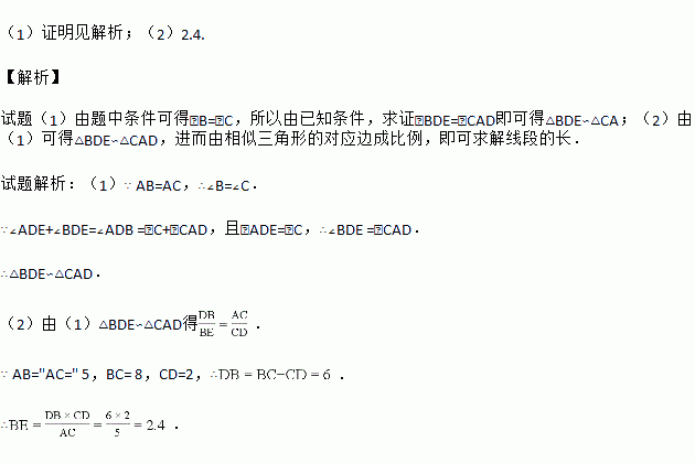已知:如图,在△ABC中,AB=AC=5,BC=8,D,E分别为BC,AB边上一点,∠ADE=∠C.